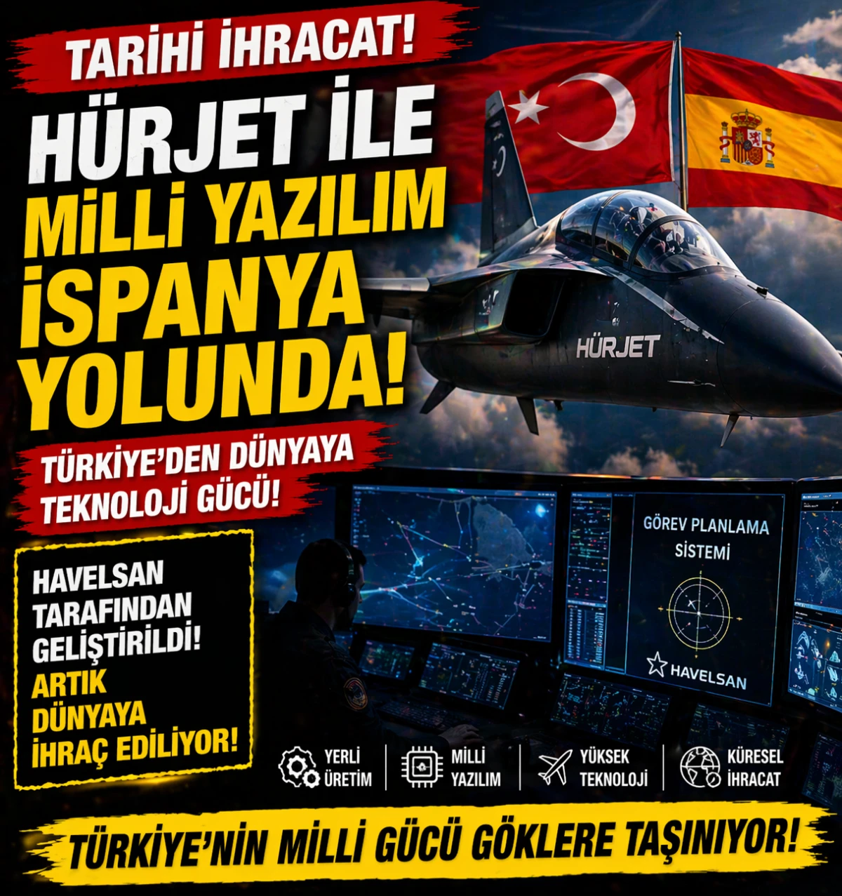 HÜRJET İçin Kritik Adım: Milli Yazılım İspanya’ya Gidiyor Türkiye’nin yerli jet eğitim uçağı HÜRJET için geliştirilen kritik sistem, uluslararası arenaya açılıyor. HAVELSAN tarafından geliştirilen Görev Planlama Sistemi, HÜRJET ile birlikte İspanya’ya ihraç edilecek.