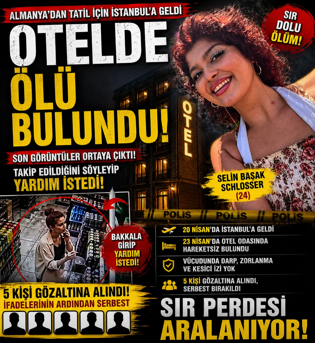Olay, 23 Nisan’da Fatih’te bir otelde meydana geldi. Edinilen bilgilere göre, 20 Nisan’da Türkiye’ye gelen 24 yaşındaki Selin Başak Schlosser’den bir süre haber alınamadı. Durumu fark eden otel görevlileri, yetkililere ihbarda bulundu.